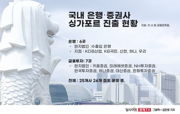 현재 싱가포르에는 약 600여개의 글로벌 금융사가 진출해있다. 국내에서도 은행, 증권, 보험, 여전사 등 다양한 업권에서 20여 개의 점포를 싱가포르 내에서 운영 중이다.