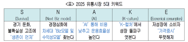 대한상공회의소(회장 최태원)는 7일 ‘2025 유통산업 백서’를 발간하고, 푸른 뱀의 해인 2025년 소비시장의 키워드로 ‘S.N.A.K.E’를 제시했다고 8일 밝혔다. 대한상의는 “경기침체와 불확실성 고조에 생존(S) 경쟁이 더욱 치열해진 만큼 유통기업은 차세대(N) 비즈니스모델과 수익모델을 찾아야 한다”며 “AI(A)와 K컬쳐(K)에서 성장 돌파구를 찾고, 가격중시(E) 소비트렌드에도 적극 대응할 필요가 있다”고 전했다. 유통산업 백서에는 ▲국내 소매업태별 동향·이슈 및 전망 ▲주요국 유통산업 동향 등 국내외 유통산업의 최신 동향·이슈와 전망을 담았으며 대한상의 홈페이지에서 무료로 다운받을 수 있다.